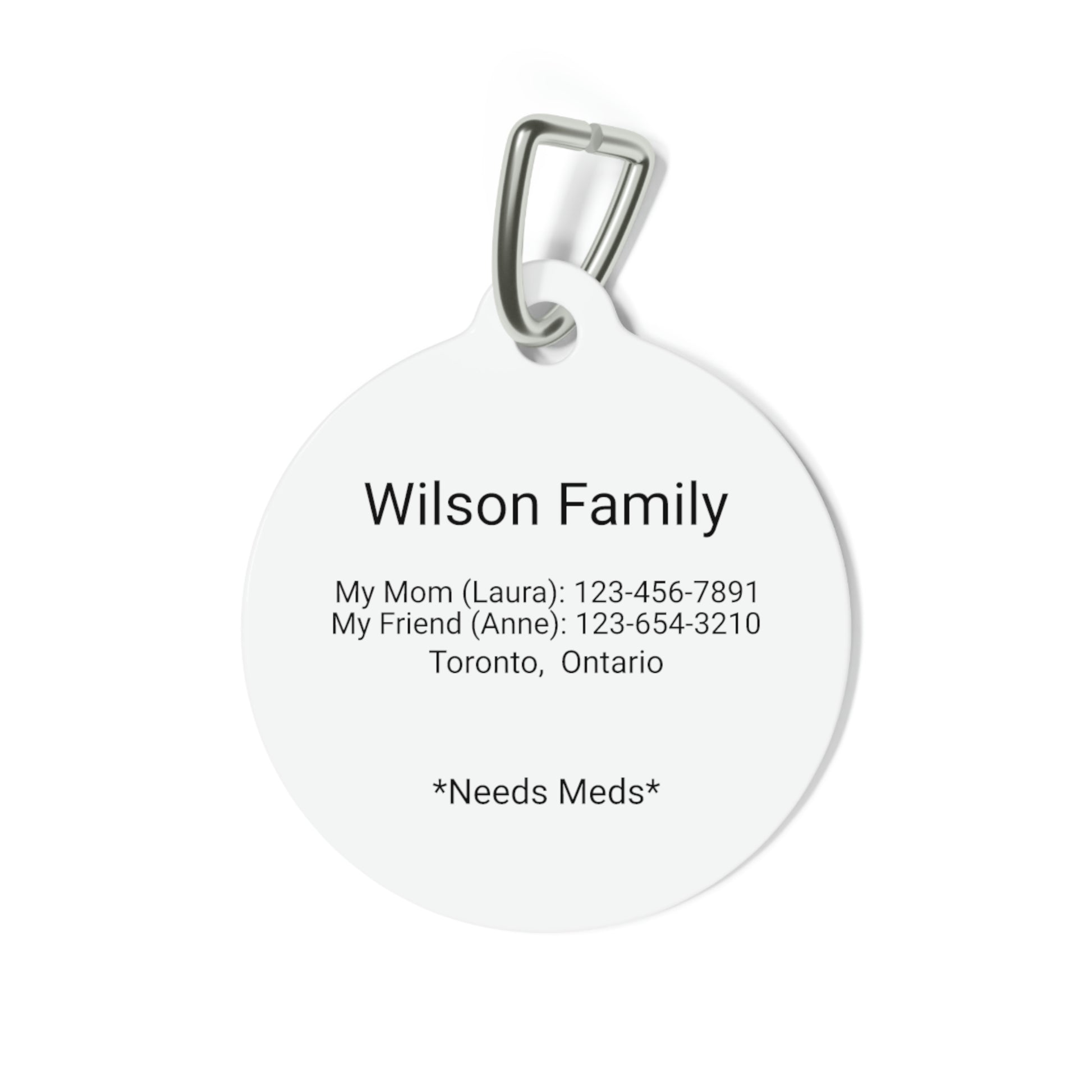Personalized pet tags provide a fresh way to spice up a furry friend's collar. The tag and clip are both made of metal. This increased durability comes in handy, as collar pieces can snag on brush, corners, etc. Size: 1" round and metal clip included.